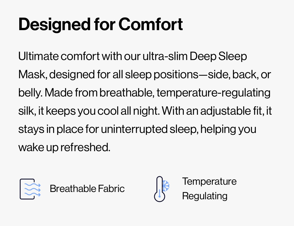 Our Deep Sleep Mask blocks out light effectively, creating a dark environment that promotes deep, uninterrupted sleep. Secondly, due the comfortable fit, it stays in place throughout the night. The soft breathable silk fabric allows for proper airflow and gives an extremely relaxing feeling to your eyes. Falling asleep, was never this easy.